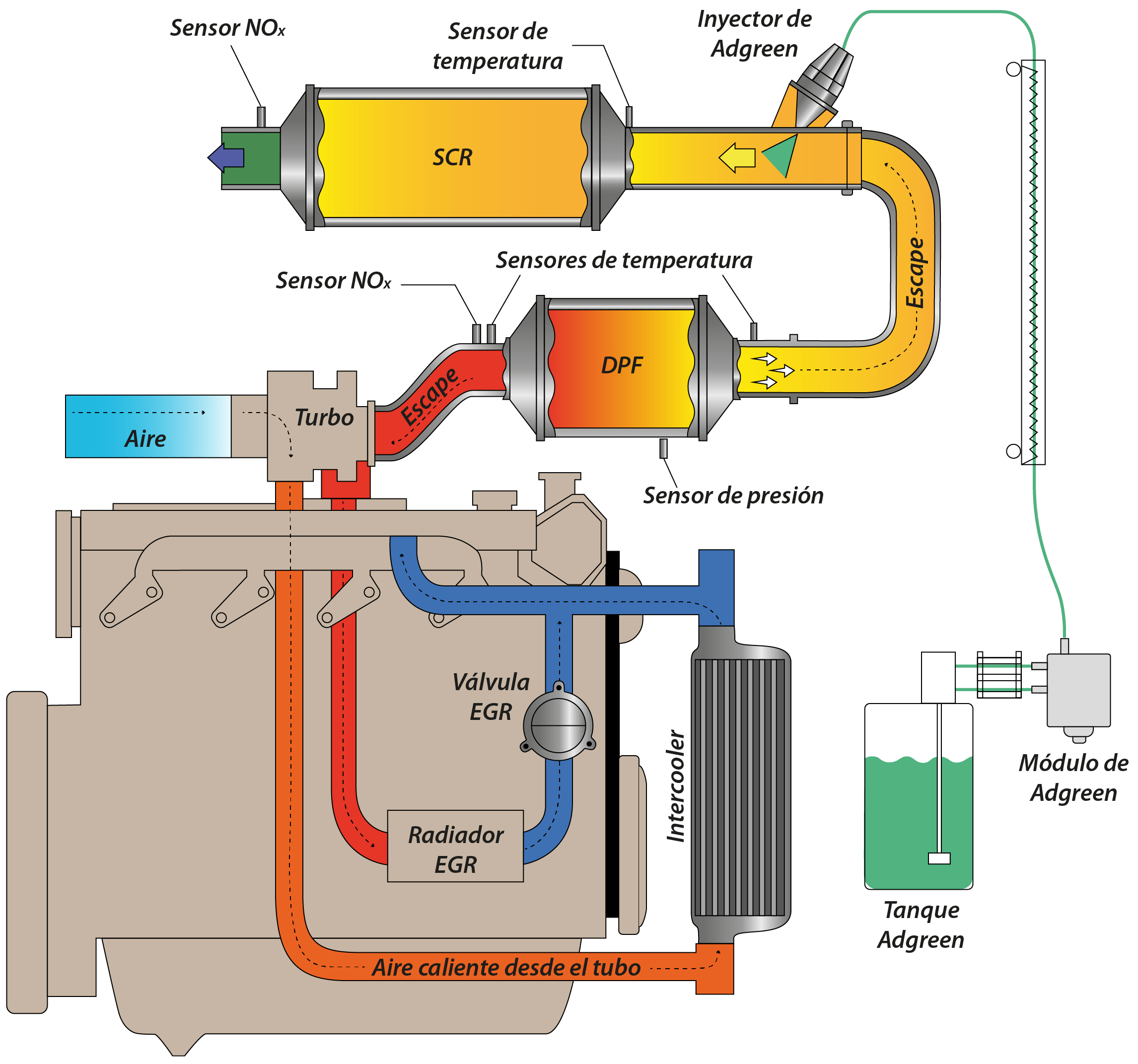 La urea automotriz se inyecta en el tubo de escape y reacciona con el calor descomponiendo los gases de amoniaco y CO2. Al ingresar los gases al catalizador, se generan nitrógeno y vapor de agua, los cuales son amigables con el medio ambiente.